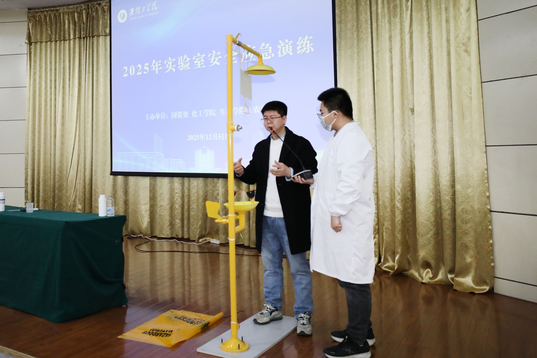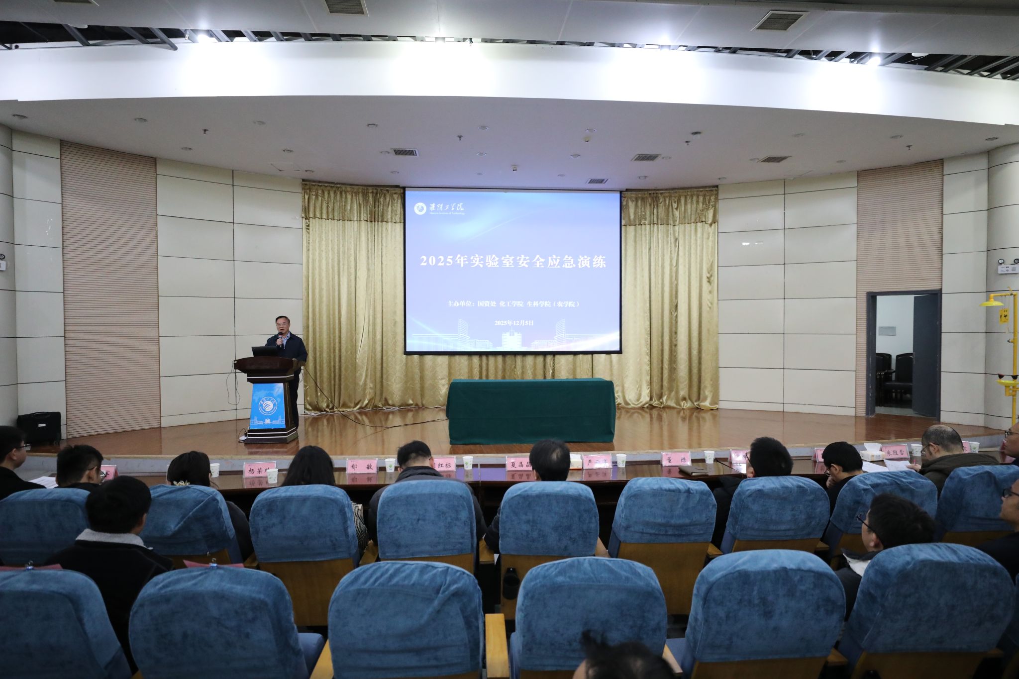 为了提升师生实验室安全防护与事故应急处置能力,12月5日,我校在枚乘路校区南园报告厅举行2025年实验室安全培训与应急演练。校党委常委、副校长严云洋出席活动并讲话。