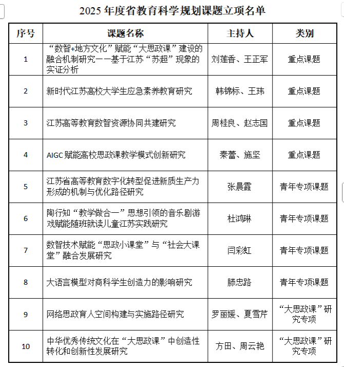 近日,江苏省教育科学规划领导小组办公室发布《关于公布2025年度省教育科学规划课题立项名单的通知》,我校获批10项课题,其中重点课题4项、青年专项课题4项、“大思政课”研究专项2项,课题获批比例历年最高。