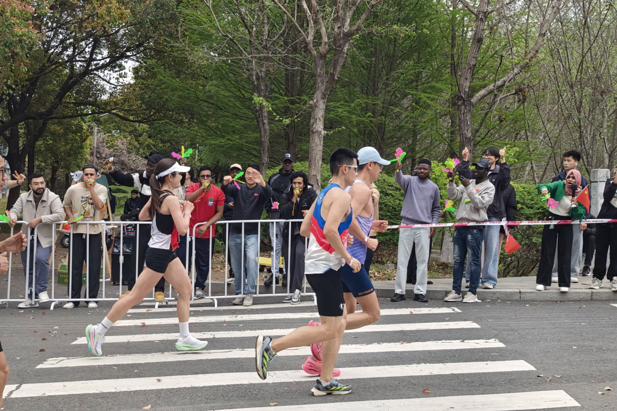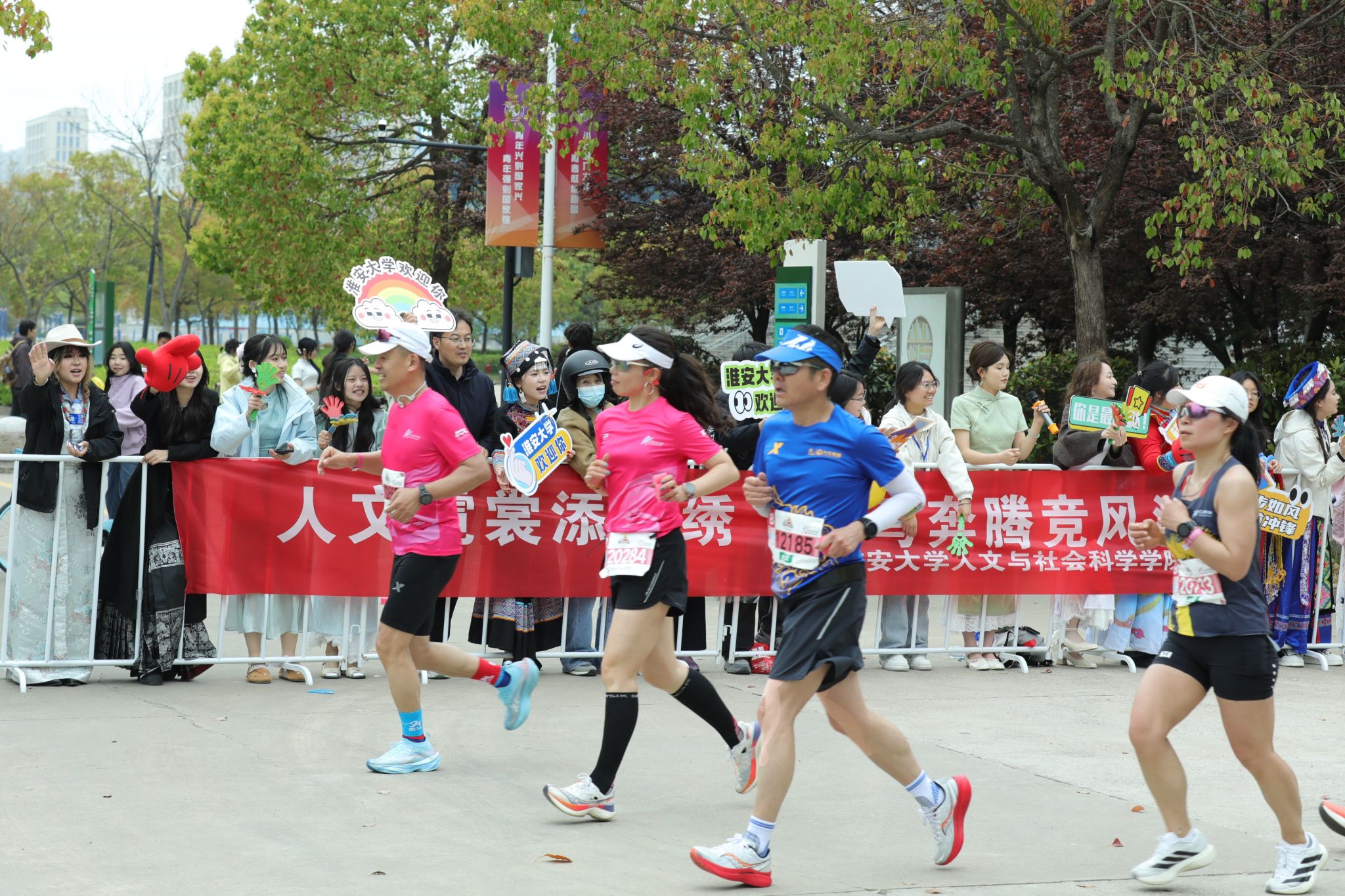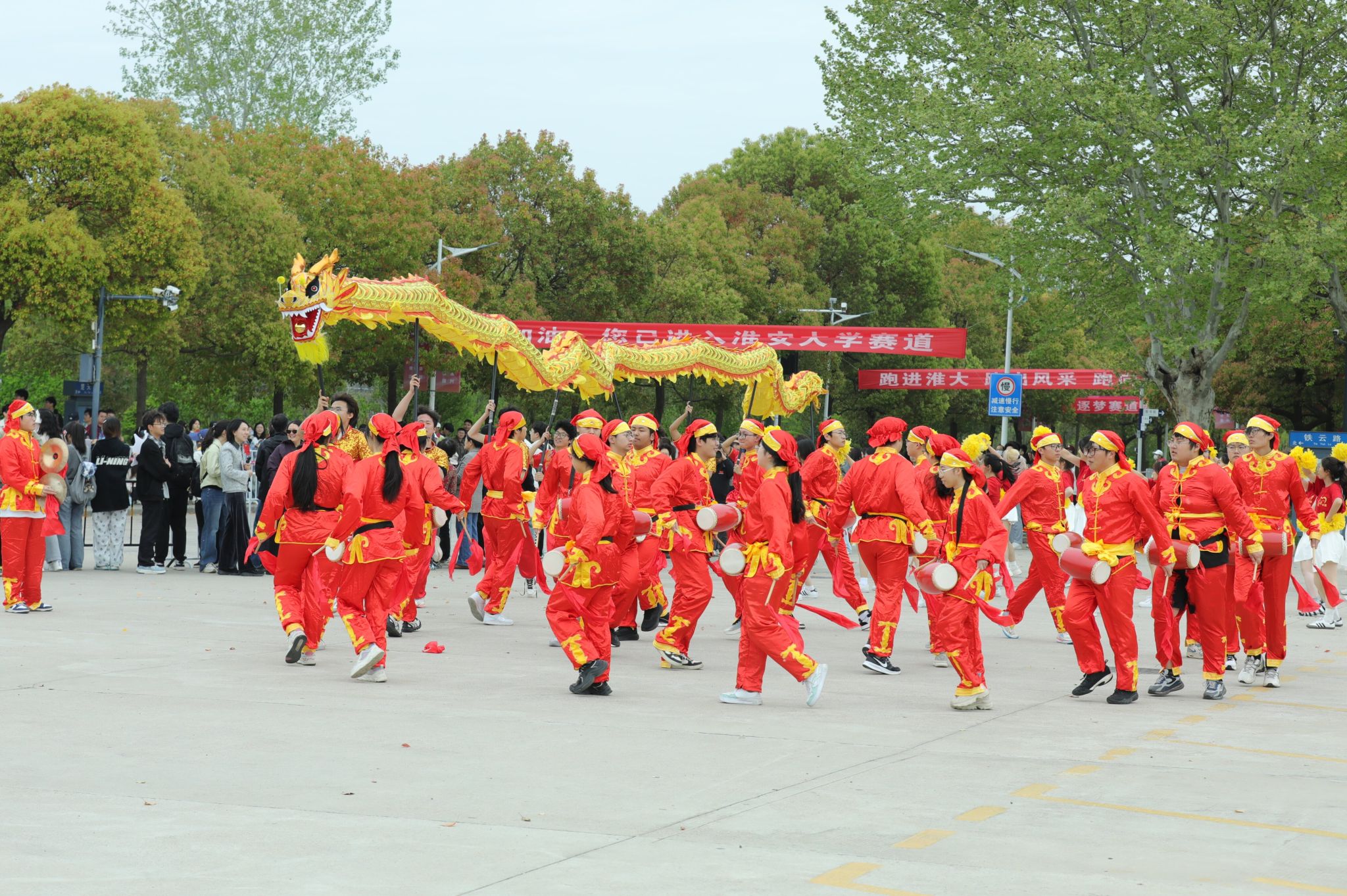 约9时20分后,参赛选手陆续进入我校校园赛道。此时,校园内早已悬挂好为选手加油鼓劲的横幅,赛道上绘画了充满活力的图案,数千名大学生手持加油牌,挥舞着旗帜,用此起彼伏的呐喊声为选手们助力续航。除了啦啦队的激情助威,学校精心准备了多个特色表演项目,将现场的气氛烘托至沸点。