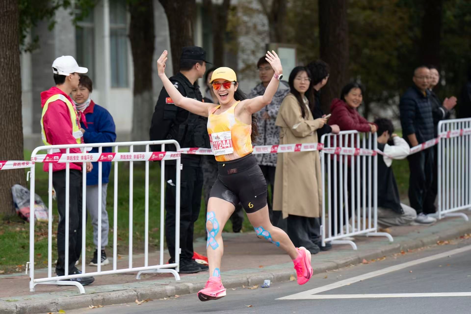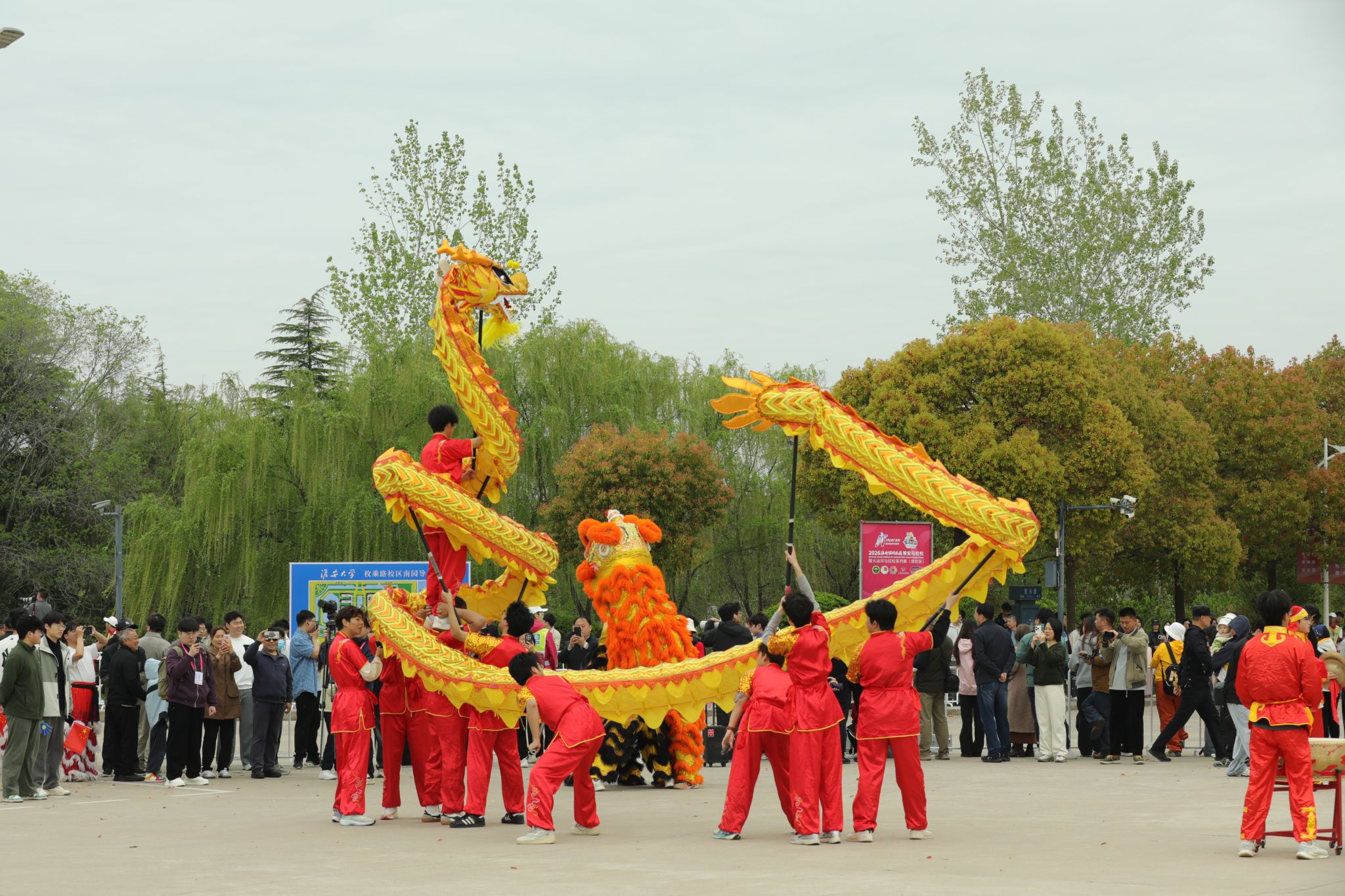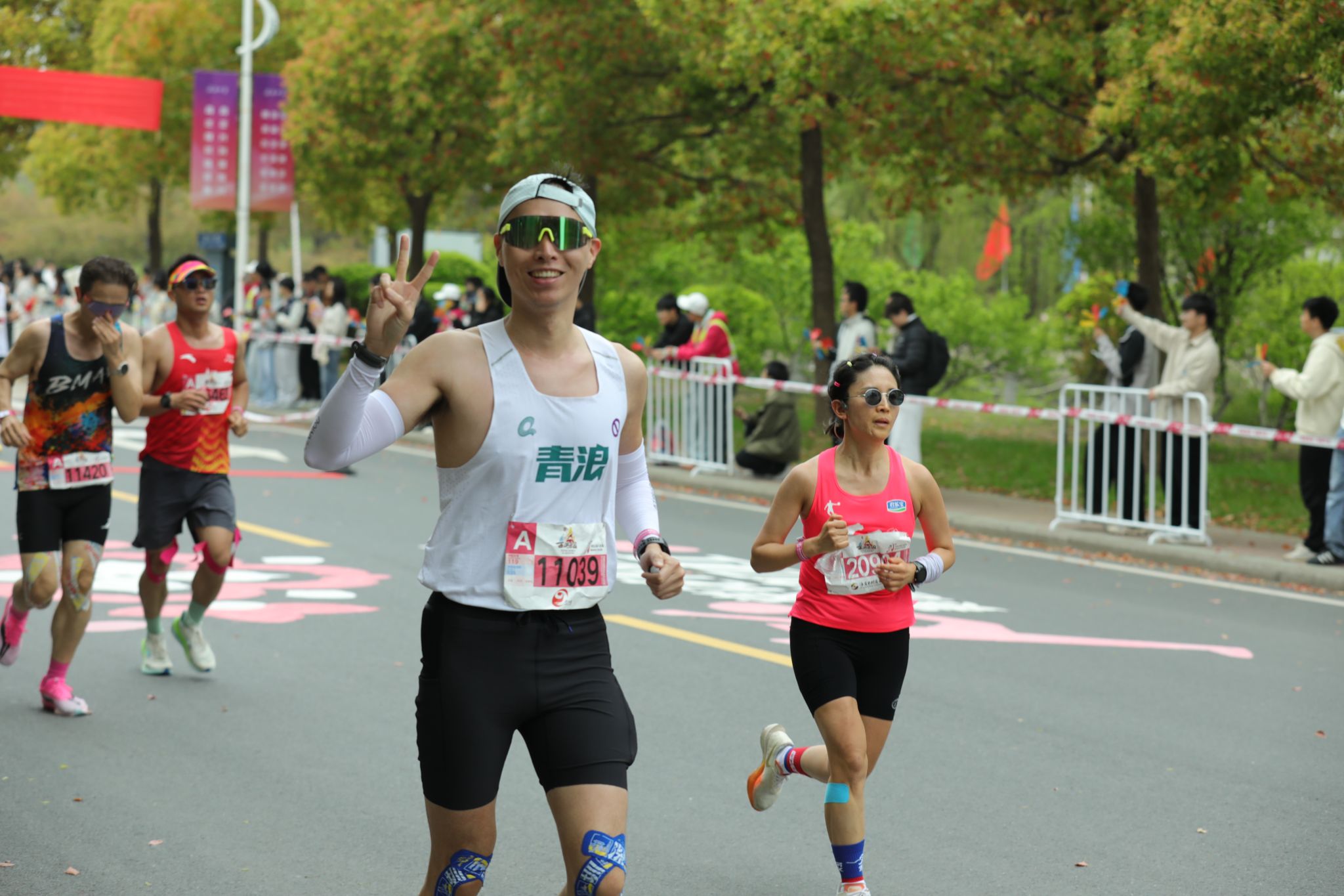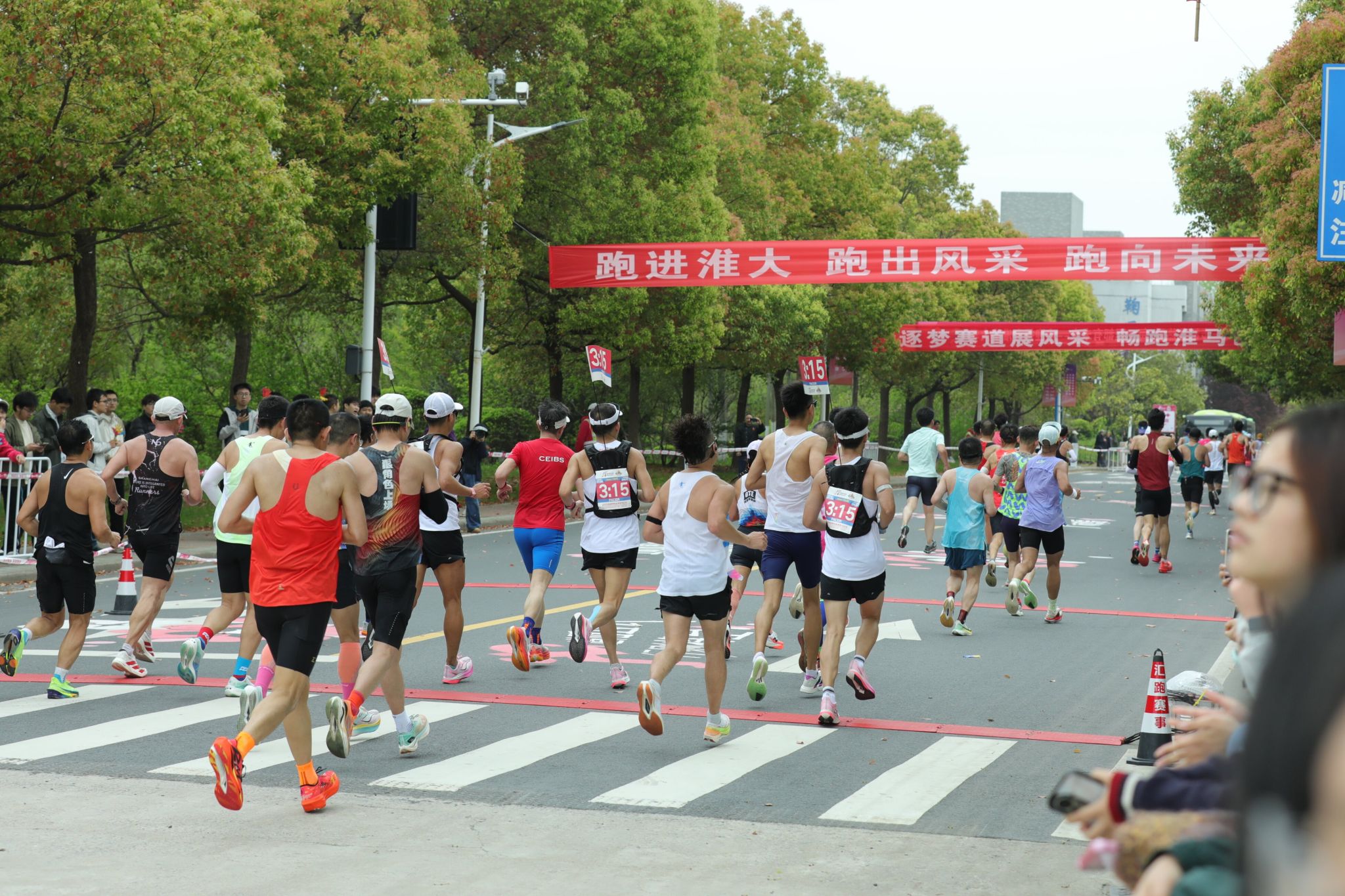 约9时20分后,参赛选手陆续进入我校校园赛道。此时,校园内早已悬挂好为选手加油鼓劲的横幅,赛道上绘画了充满活力的图案,数千名大学生手持加油牌,挥舞着旗帜,用此起彼伏的呐喊声为选手们助力续航。除了啦啦队的激情助威,学校精心准备了多个特色表演项目,将现场的气氛烘托至沸点。