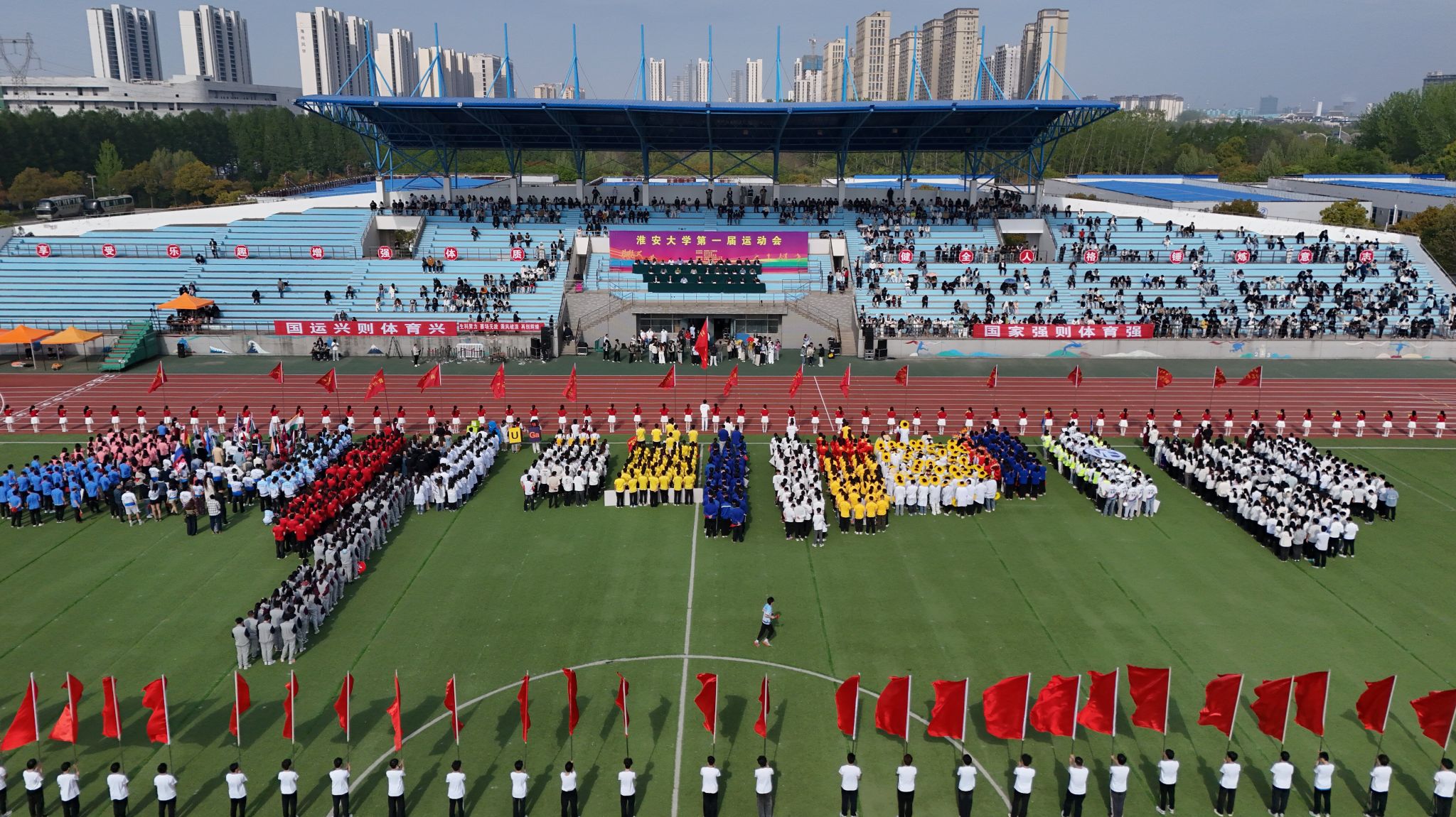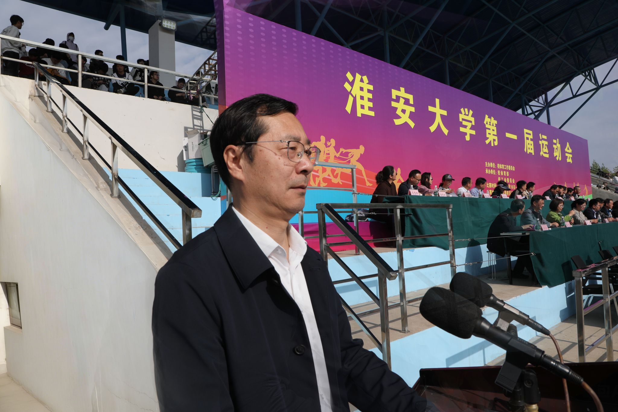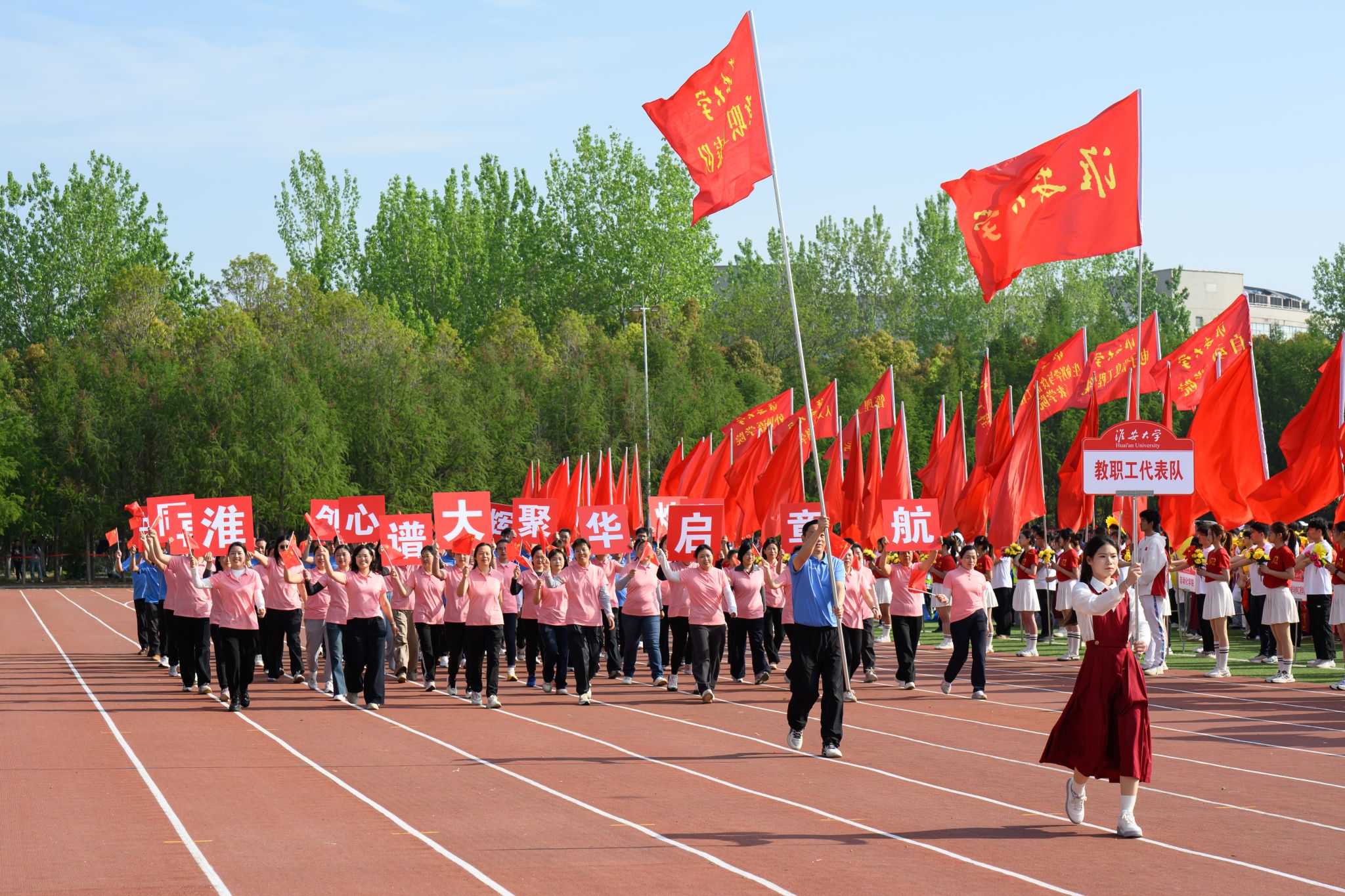 4月16日,淮安大学第一届运动会在枚乘路校区南园田径场开幕。全体在淮校领导出席开幕式。校党委书记常绿宣布运动会开幕,校长郑锋致开幕词,副校长王立彬主持开幕式。