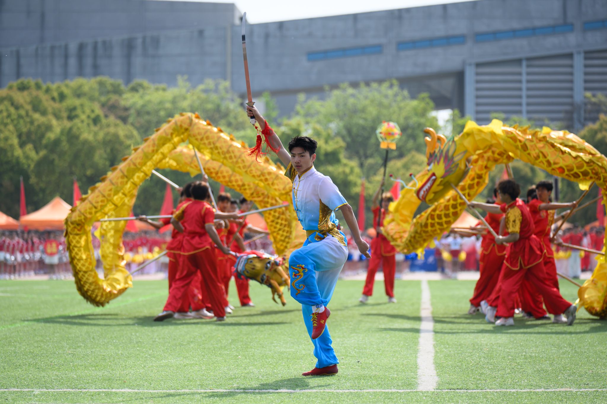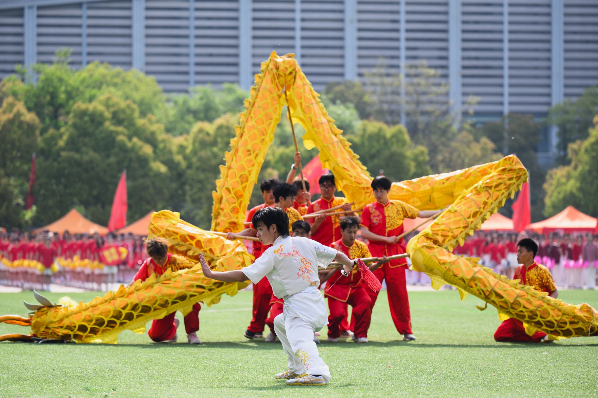 入场式后,龙狮献瑞·武韵风华、跃马逐光等节目依次上场表演,现场表演既有传统体育的恢宏气势,又有现代舞蹈的活泼灵动,将体育精神与艺术魅力有机融合、相得益彰,引来观众阵阵掌声,将现场氛围推向高潮。